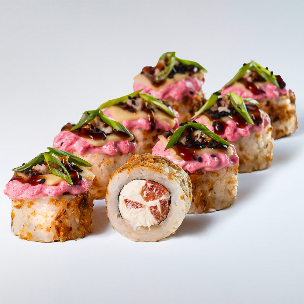 Нори, рис "SHINAKI", творожный сыр, курица холодного копчения, томаты, сыр "Пласти", лук пай, лук зеленый, кунжут, соус "Лава"