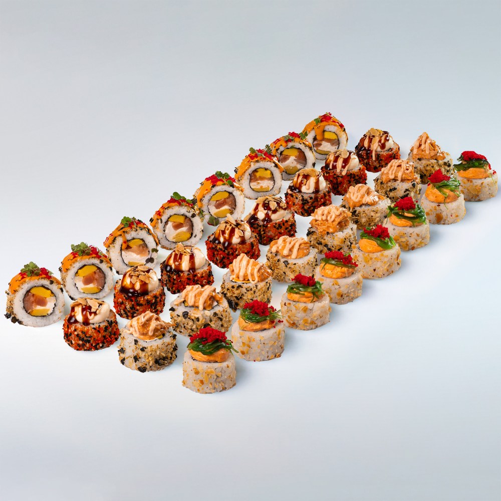 Лосось с томаго 8 шт Запеченный цыпленок спайси 8 шт Лосось с чукой и миндалем 8 шт Горячий снежный краб 8 шт 3 соевых соуса 2 имбиря 2 васаби