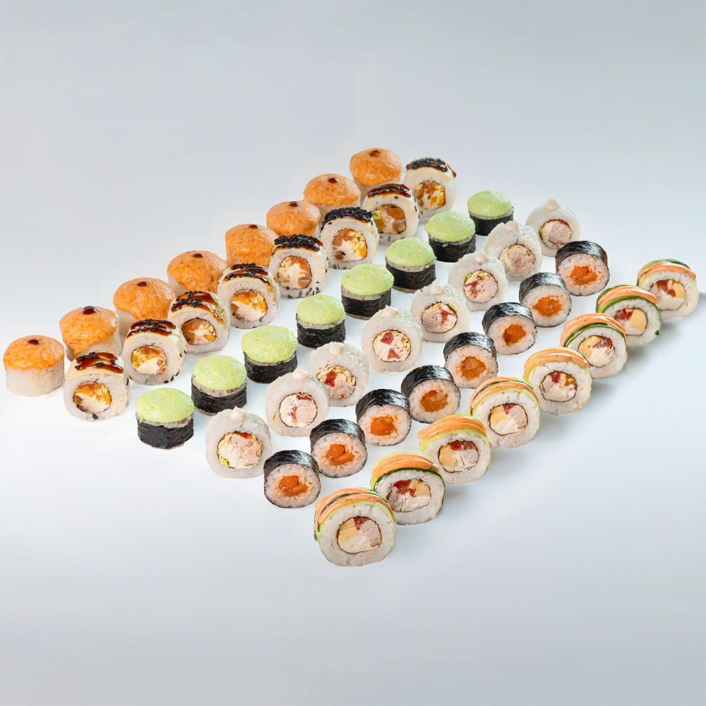 Опаленный манго 8 шт Гейша 8 шт Фрэш ролл 8 шт Цезарь 8 шт Тори запеченный 8 шт Сяке маки 8 шт 4 соевых соуса 2 имбиря 2 васаби