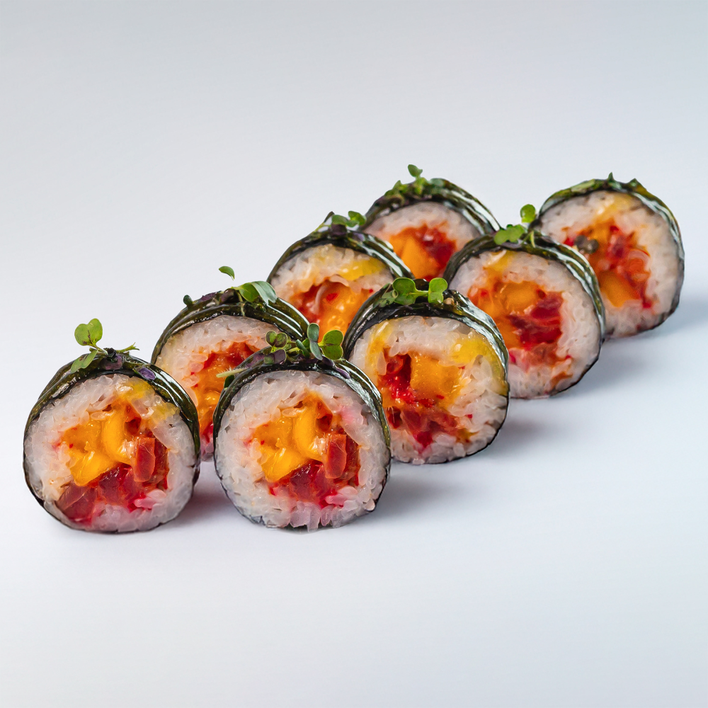 Рис, нори, манго, тунец тартар, лук зелёный, икра масаго, желе манго