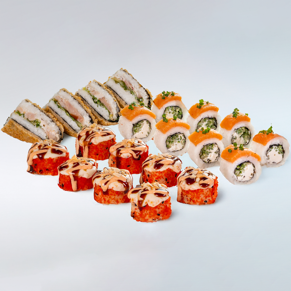 Филадельфия лайт - 8шт Сэндвич с курицей - 4шт Запеченный снежный краб - 8шт 2 соевых соуса 1 имбирь 1 васаби