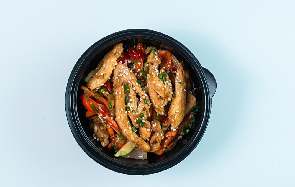 Рис, куриное филе, болгарский перец, лук репчатый, цукини, морковь, чеснок, зеленый лук, соус на выбор