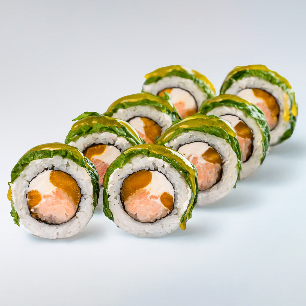 Нори, рис "SHINAKI", творожный сыр, сочный манго, красная рыба в кляре, айсберг, соус манго-чили Данный продукт может содержать мелкие фрагменты косточек