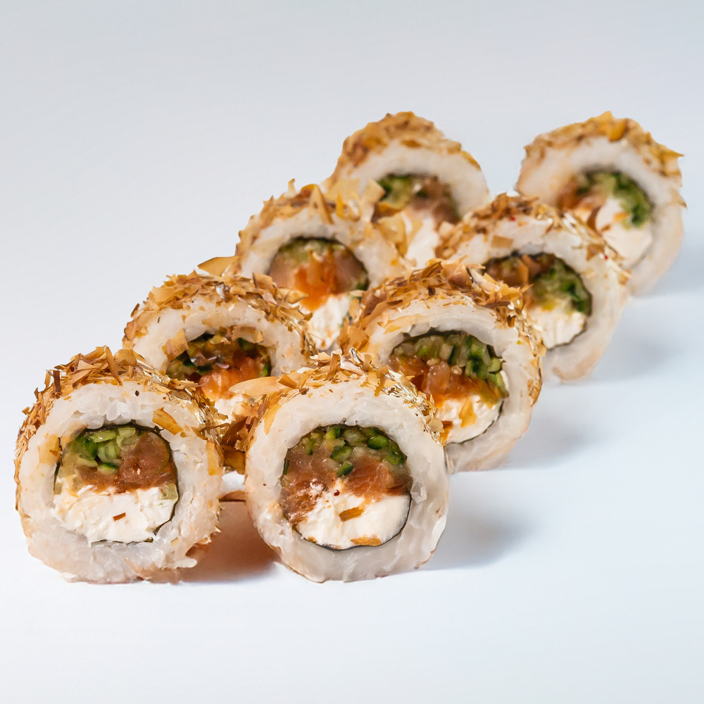 Нори, рис "SHINAKI", норвежский лосось, творожный сыр, огурцы, стружка тунца Данный продукт может содержать мелкие фрагменты косточек