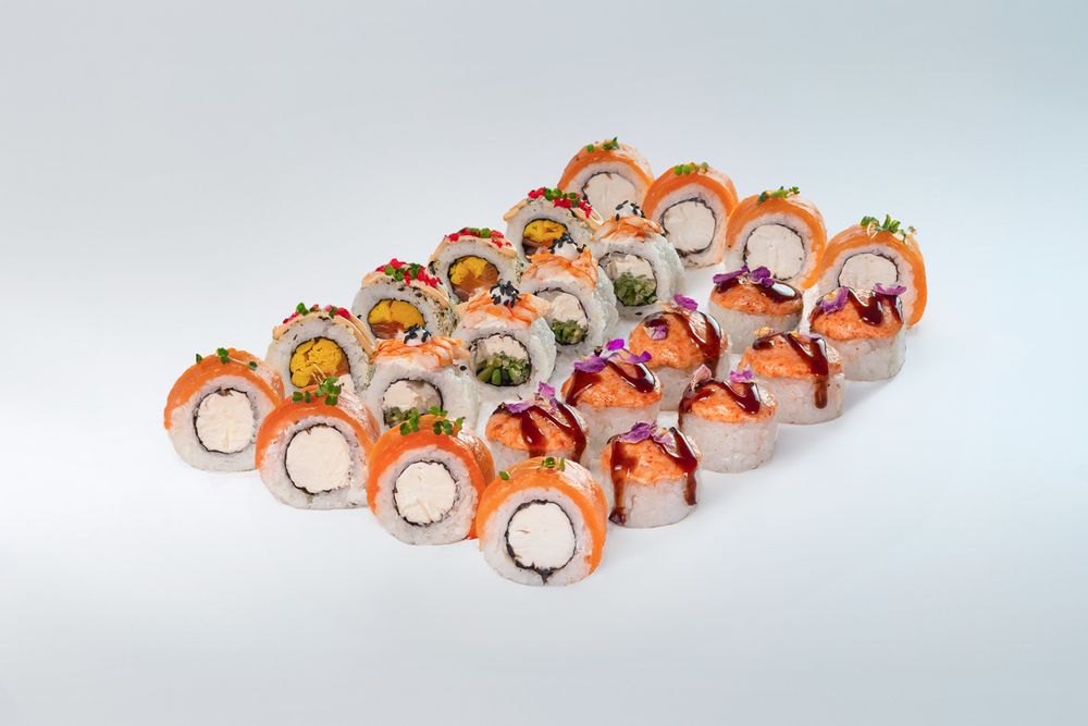 Филадельфия классическая 8 шт Филадельфия с креветкой 4 шт Гейша 8 шт Ролл лосось с томаго 4 шт 2 соевых соуса 1 имбирь 1 васаби