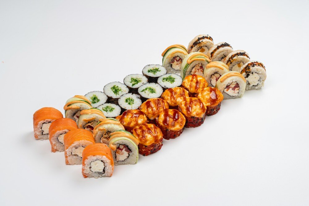 Филадельфия классическая 4 шт Унаги фила 4 шт Фреш ролл 8 шт Каппа маки 8 шт Паприка 8 шт 3 соевых соуса 2 имбиря 2 васаби Данный продукт может содержать мелкие фрагменты косточек