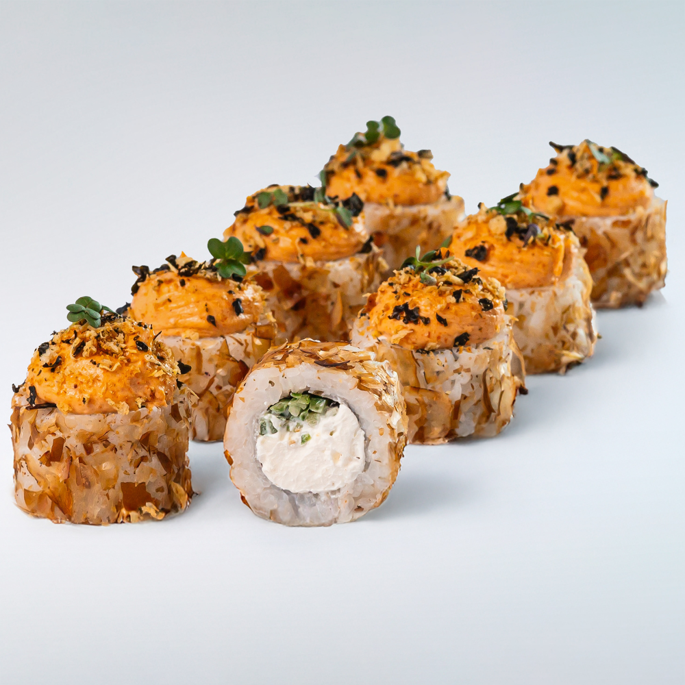 Рис, нори, сыр творожный, огурец, стружка тунца, микрозелень, нори-посыпка, нежный фирменный мусс из лосося
