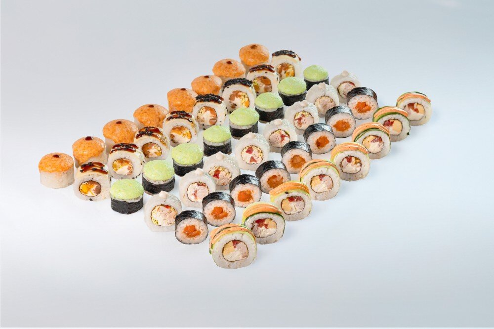 Лава с лососем 8 шт Гейша 8 шт Фрэш ролл 8 шт Цезарь 8 шт Эби хот маки 8 шт Сяке маки 8 шт 4 соевых соуса 2 имбиря 2 васаби