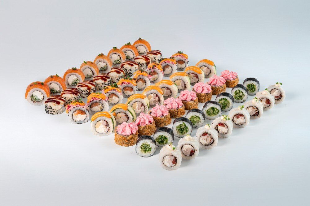 Ролл с курицей в сливочной шапке - 8шт Цезарь - 8шт Фрэш ролл - 8шт Лава темпура - 8шт Филадельфия с огурцом - 8шт С лососем и крабом - 8шт Каппа маки - 8шт Соевый соус - 4шт Имбирь - 2шт Васаби - 2шт