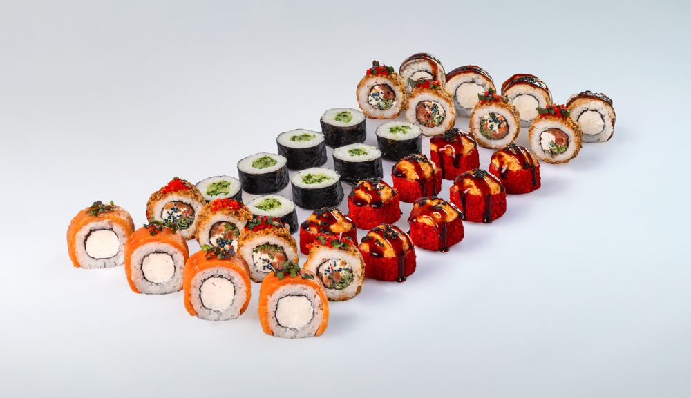 Филадельфия классическая 4 шт Унаги фила 4 шт Фреш ролл 8 шт Каппа маки 8 шт Паприка 8 шт 3 соевых соуса 2 имбиря 2 васаби Данный продукт может содержать мелкие фрагменты косточек