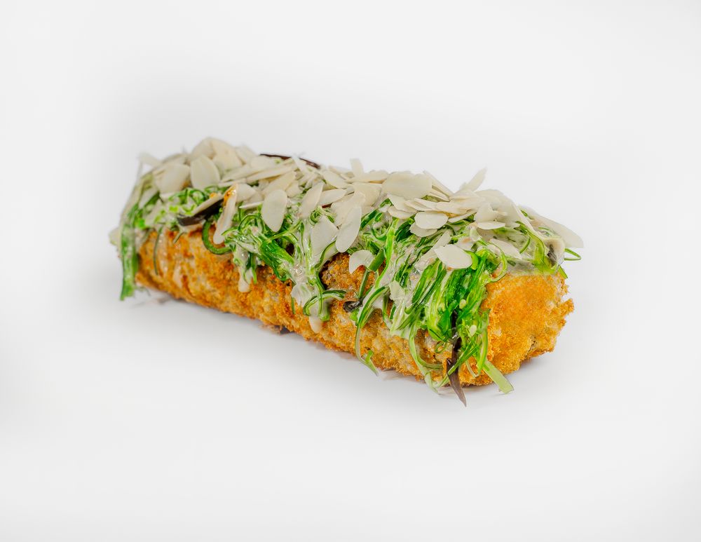 Нори, рис "SHINAKI", лосось терияки, творожный сыр, соус "Ореховый", миндаль Данный продукт может содержать мелкие фрагменты косточек
