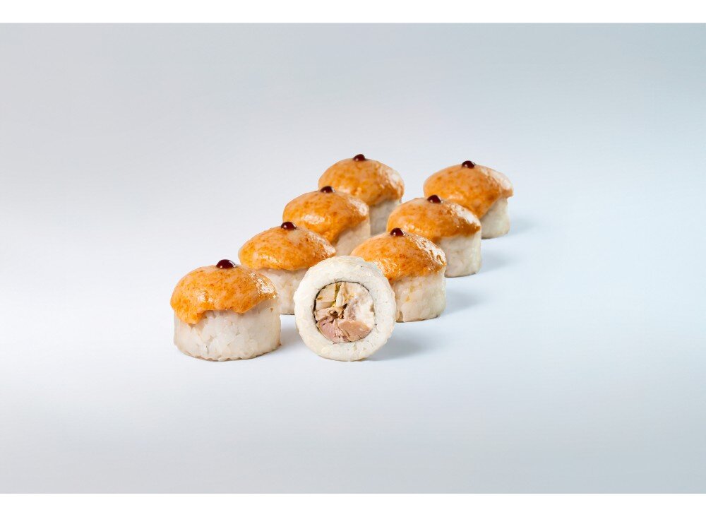 Нори, рис "SHINAKI", творожный сыр, куриное филе, айсберг, якi-шапка, соус "Унаги"