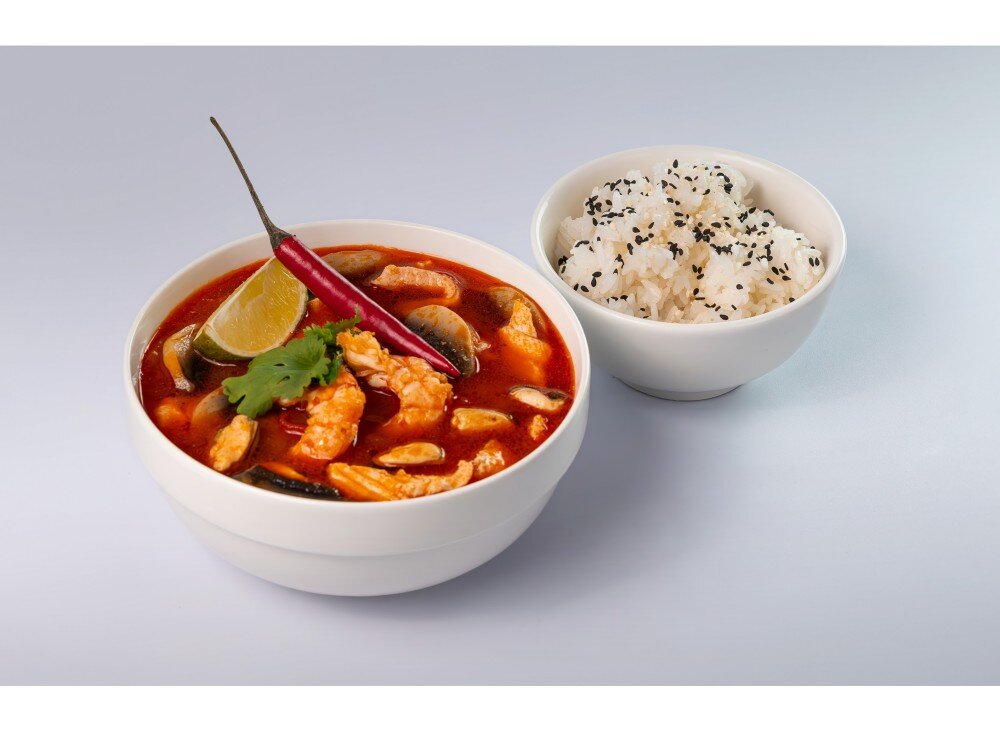 "Бульон том-ям, красная рыба, креветки, мидии, шампиньоны, помидоры, кокосовое молоко, кинза Подается с лаймом, перцем чили и рисом"