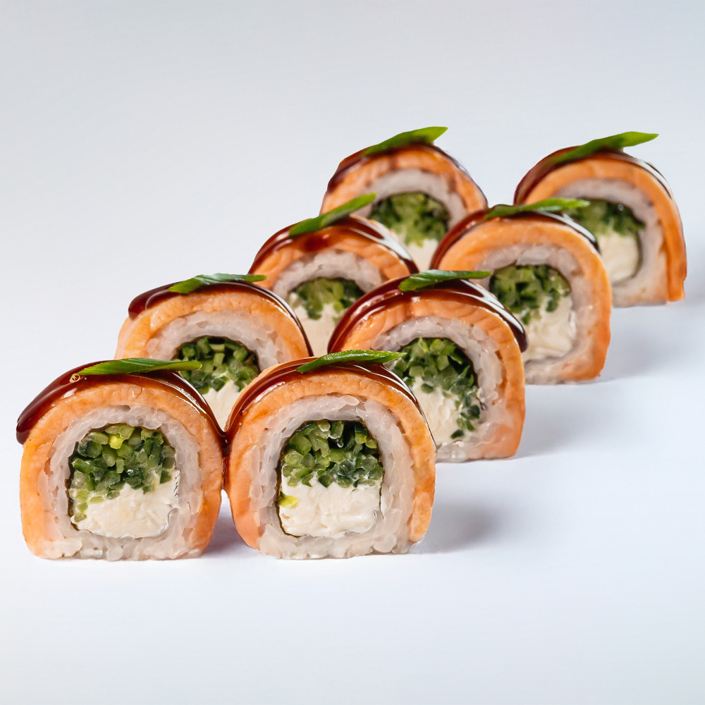 Нори, рис "SHINAKI", творожный сыр, норвежский лосось, огурец, зеленый лук, соус "Унаги" Данный продукт может содержать мелкие фрагменты косточек