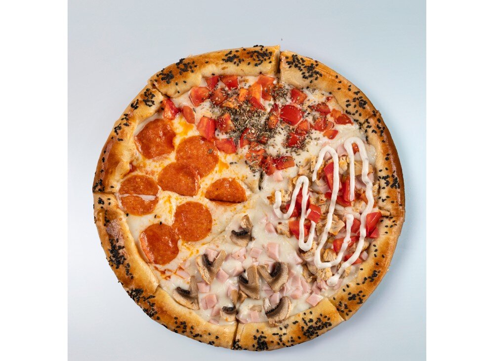 Соус "Ранч", Томатный соус, Моцарелла, Пеперони, Томаты, Куриная Ветчина , Курица, Шампиньоны, Прованские травы