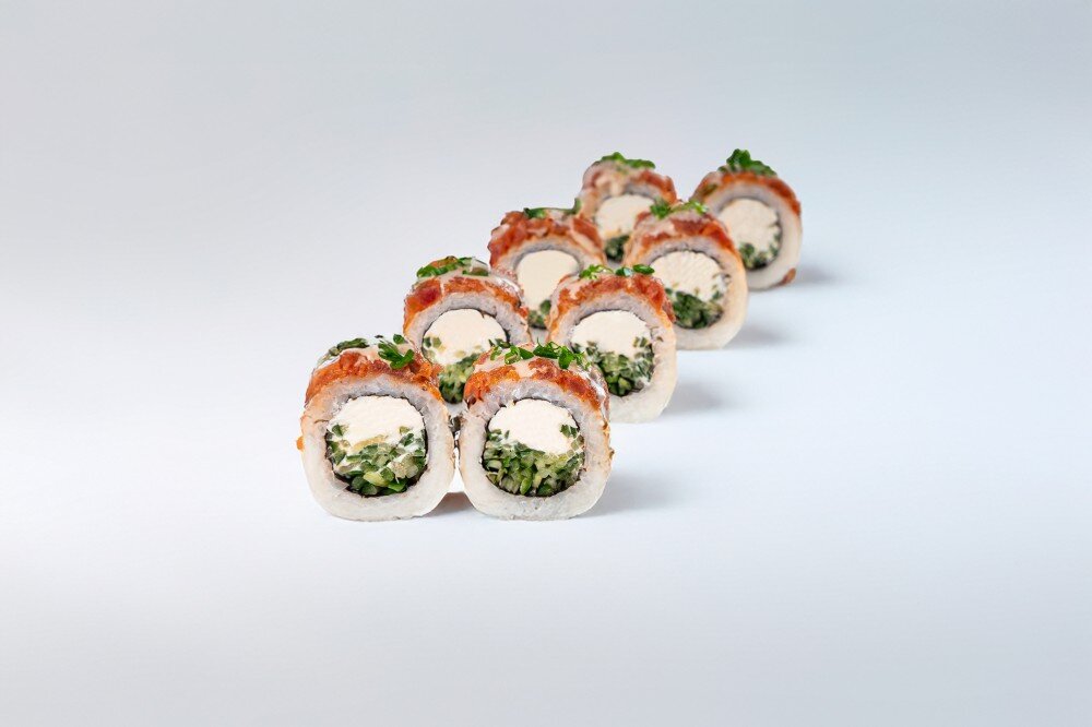 Нори, рис,творожный сыр, огурец, тунец тар-тар, ореховый соус, лук зеленый