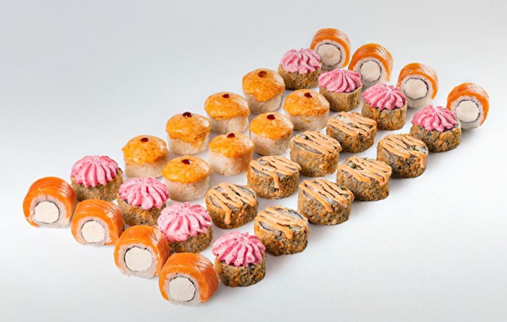 Филадельфия классическая 8 шт Лава темпура 8 шт Спайси темпура 8 шт Гейша 8 шт 3 соевых соуса 2 имбиря 2 васаби Данный продукт может содержать мелкие фрагменты косточек
