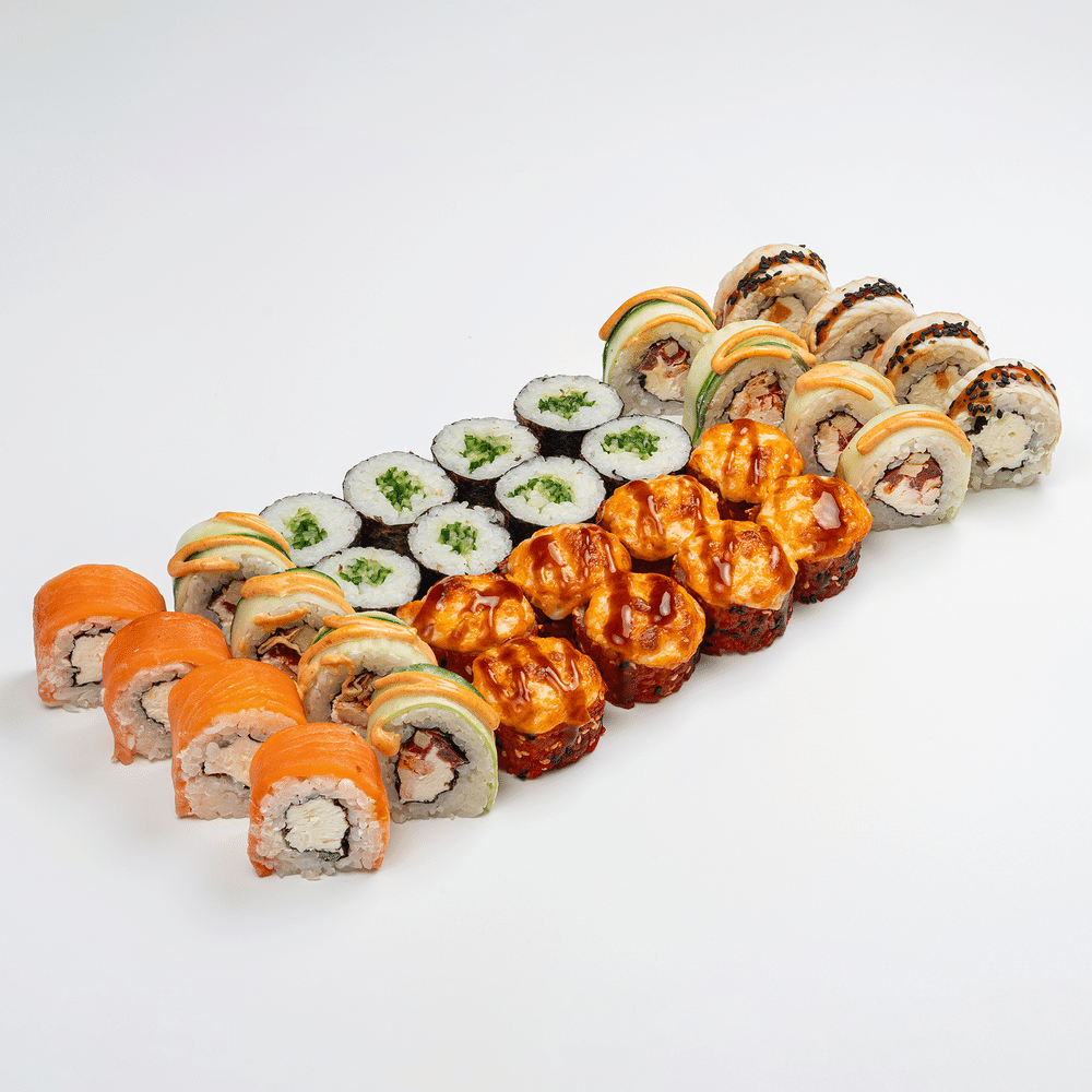 Филадельфия классическая 4 шт Унаги фила 4 шт Фреш ролл 8 шт Каппа маки 8 шт Паприка 8 шт 3 соевых соуса 2 имбиря 2 васаби Данный продукт может содержать мелкие фрагменты косточек