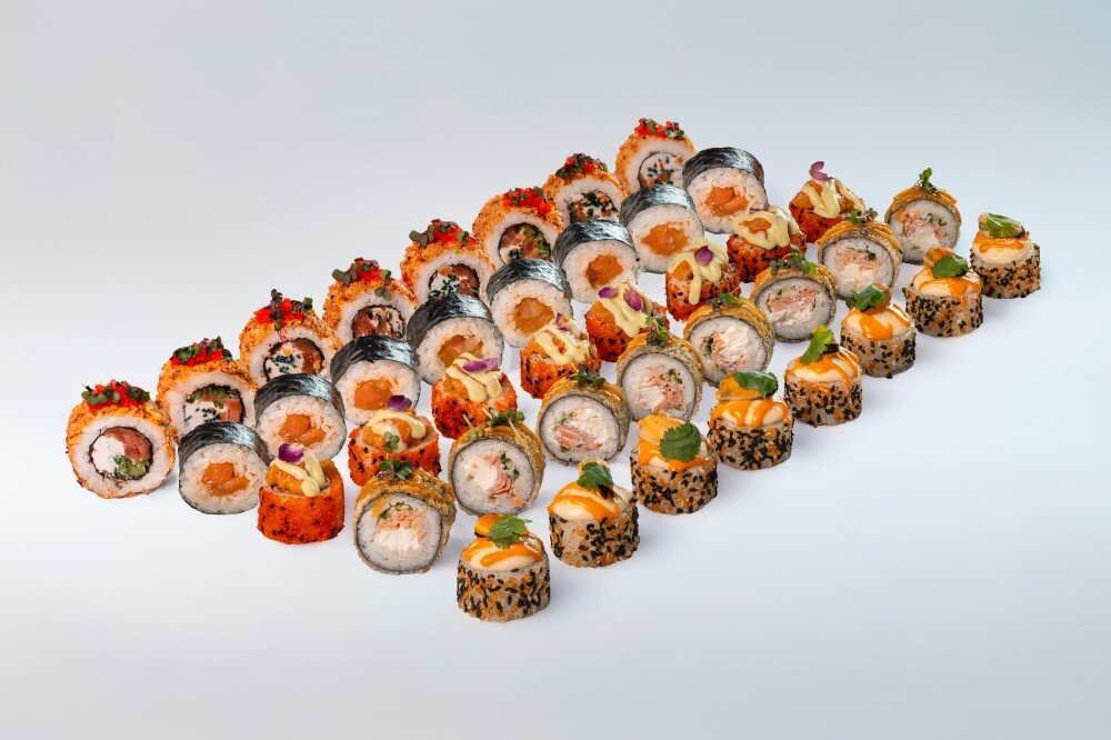 Лосось тартар с лепестками роз 8 шт Ролл с лососем и луком фри 8 шт Запеченный ролл Том-Ям с мидией 8 шт Спайси темпура 8 шт Сяке маки 8 шт 3 соевых соуса 2 имбиря 2 васаби