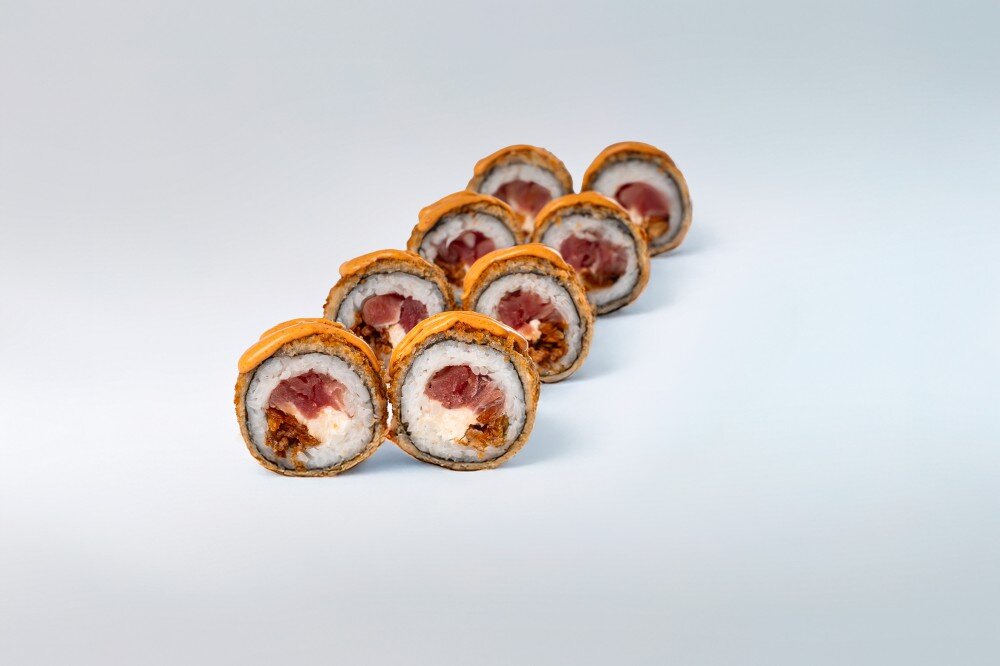 Нори, рис, творожный сыр, тунец, лук кранч, соус спайси, темпурный кляр, сухари панко