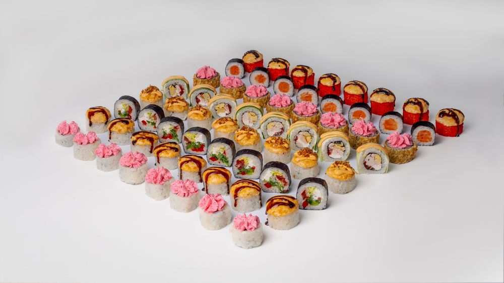 8шт Лава с лососем 8шт Лава темпура 8шт Гейша 8шт Оовщной 8шт Сяке маки 8шт Сэмпай запеченный 8шт Паприка 8шт Фрэш ролл