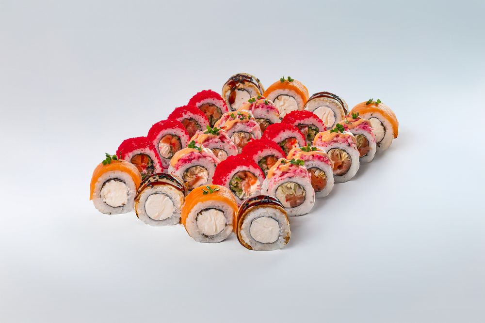 Филадельфия классическая 4 шт Унаги фила 4 шт Калифорния с лососем 8 шт С лососем и крабом 8 шт 2 соевых соуса 1 имбирь 1 васаби