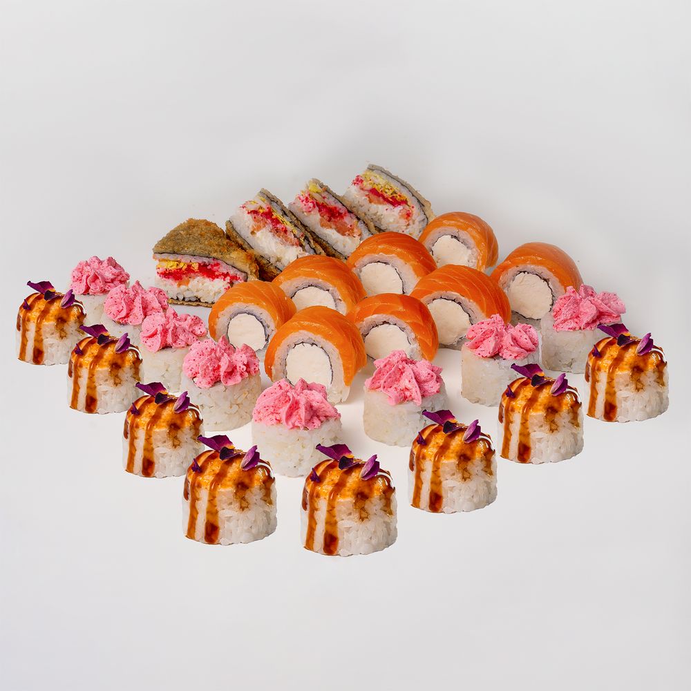 Лава с лососем 8 шт Гейша 8 шт Фрэш ролл 8 шт Цезарь 8 шт Эби хот маки 8 шт Сяке маки 8 шт 4 соевых соуса 2 имбиря 2 васаби