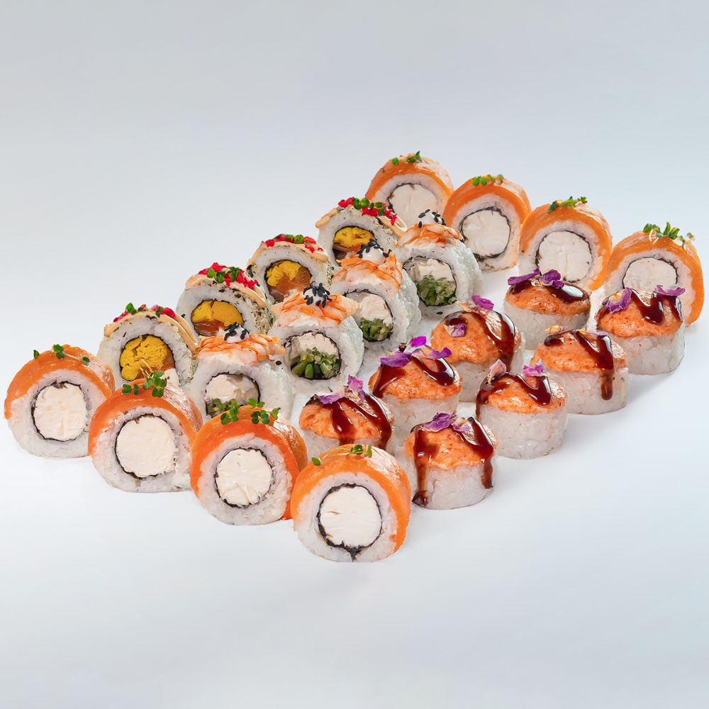 Филадельфия классическая 8 шт Филадельфия с креветкой 4 шт Гейша 8 шт Ролл лосось с томаго 4 шт 2 соевых соуса 1 имбирь 1 васаби