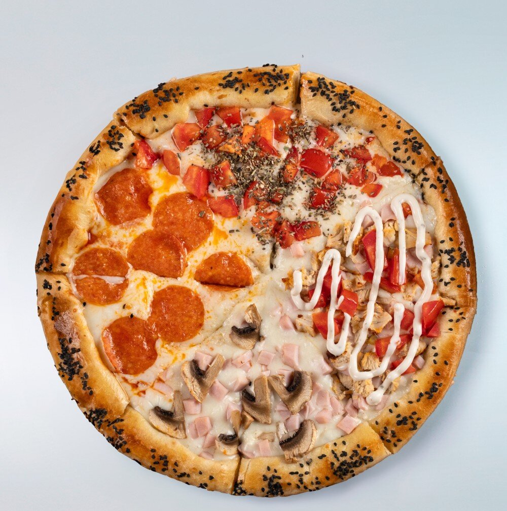 Соус HEINZ "Ранч", моцарелла, маринованный цыплёнок, куриная ветчина, томаты