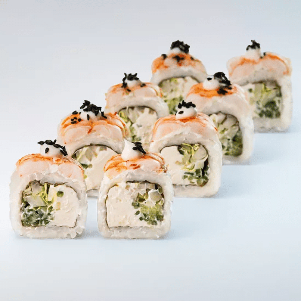 Рис "SHINAKI", творожный сыр, креветки, огурцы, салат "Айсберг", кунжут Данный продукт может содержать мелкие фрагменты косточек