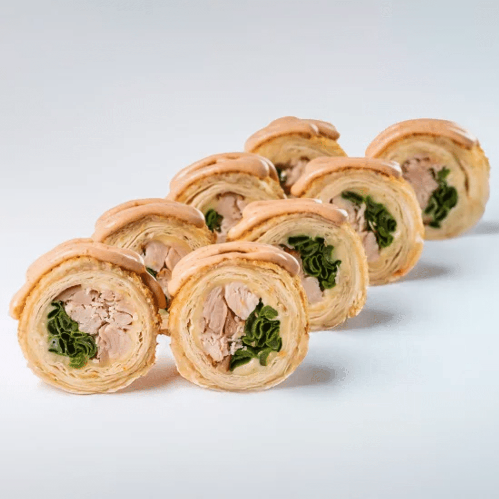 Тортилья, сыр плавленный, копченая курица, лук зеленый, фирменный сливочный соус