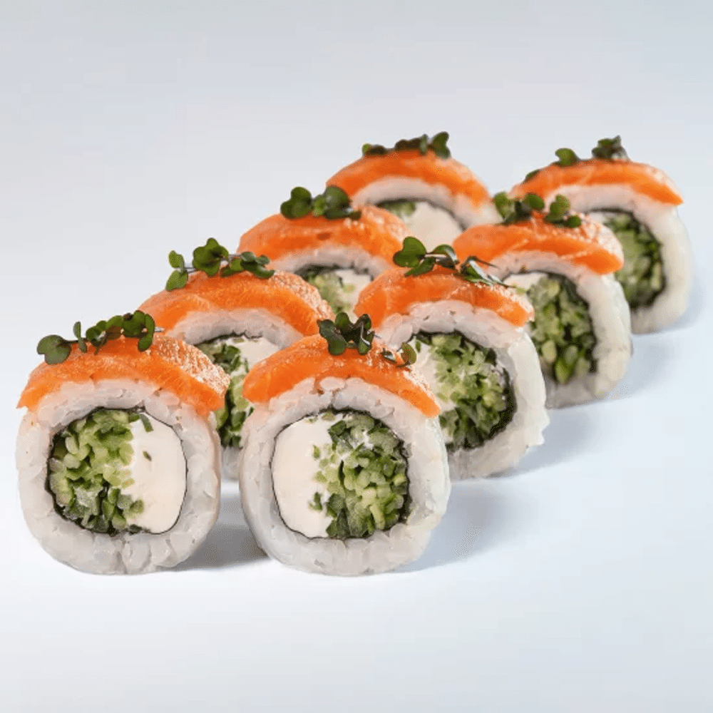 Нори, рис "SHINAKI", творожный сыр, огурец, норвежский лосось Данный продукт может содержать мелкие фрагменты косточек