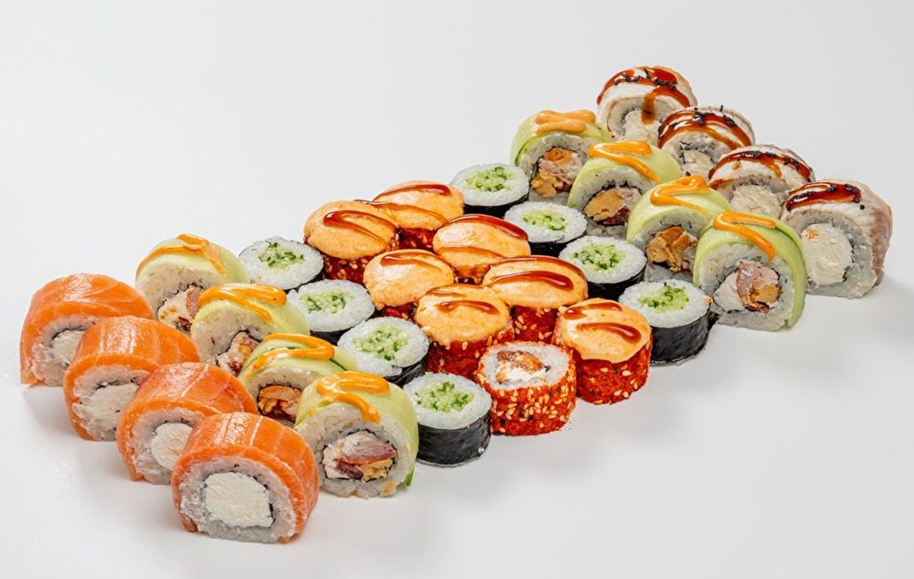 Филадельфия классическая 4 шт Унаги фила 4 шт Фреш ролл 8 шт Каппа маки 8 шт Паприка 8 шт 3 соевых соуса 2 имбиря 2 васаби Данный продукт может содержать мелкие фрагменты косточек
