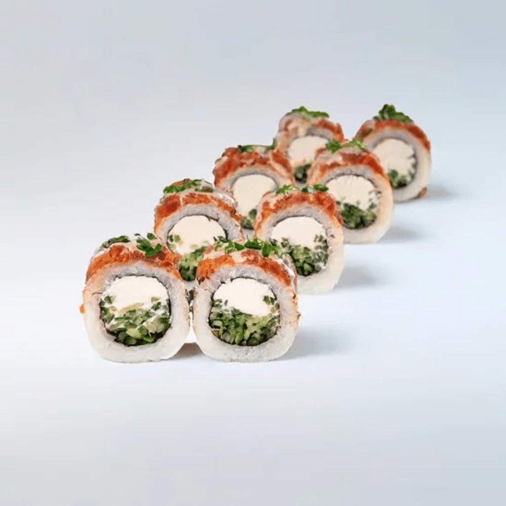Нори, рис,творожный сыр, огурец, тунец тар-тар, ореховый соус, лук зеленый