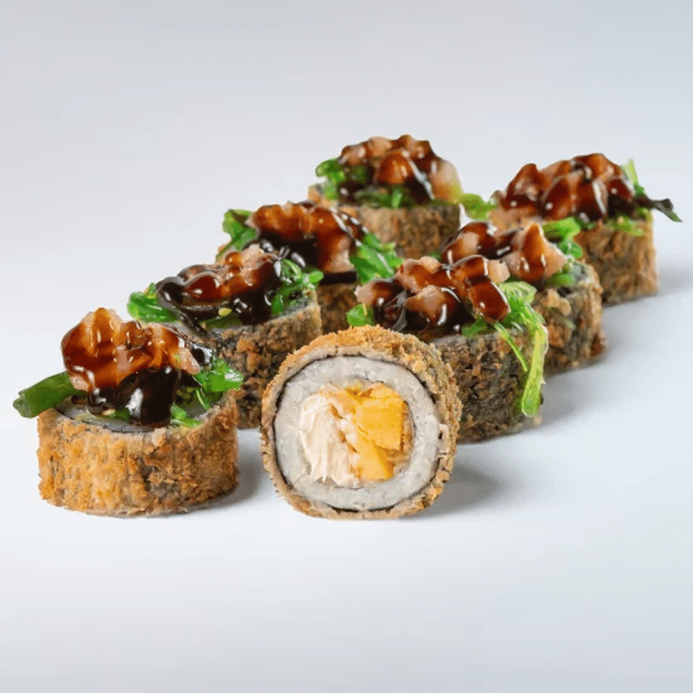 Нори, рис "SHINAKI", творожный сыр, тартар из лосося и чуки с соусом "Унаги", блинчик "Томаго", "Айсберг" Данный продукт может содержать мелкие фрагменты косточек