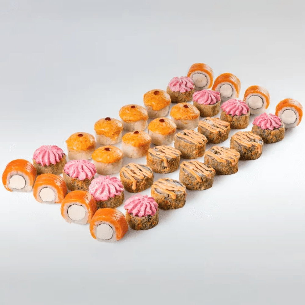 Филадельфия классическая 8 шт Лава темпура 8 шт Спайси темпура 8 шт Гейша 8 шт 3 соевых соуса 2 имбиря 2 васаби Данный продукт может содержать мелкие фрагменты косточек