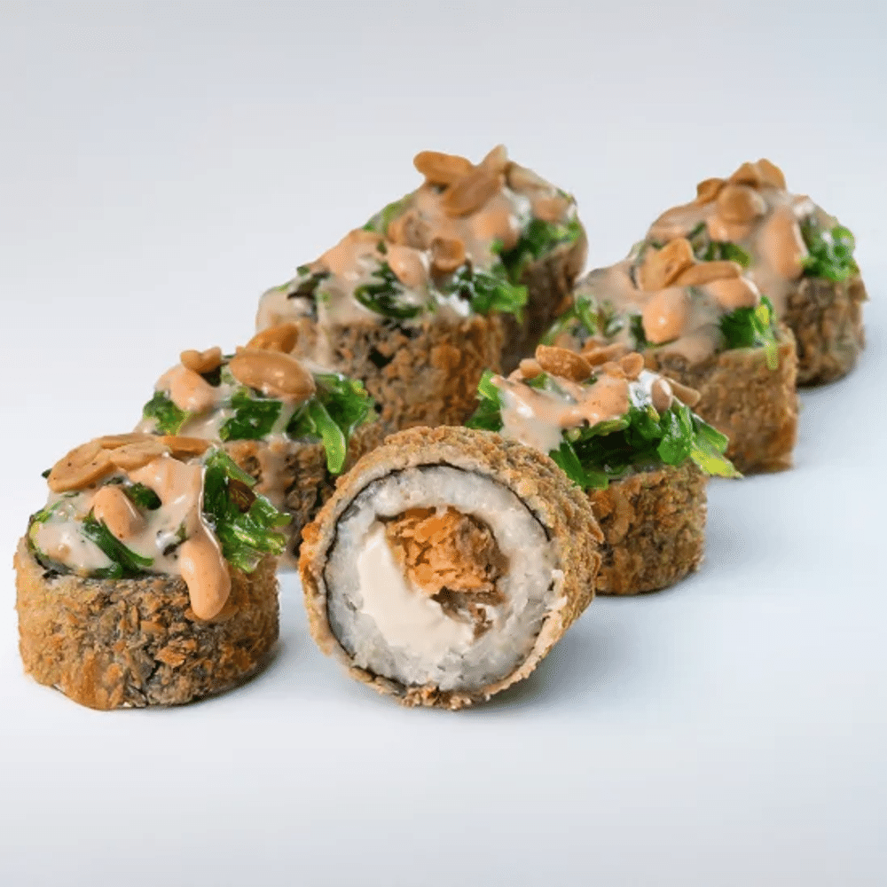 Нори, рис "SHINAKI", творожный сыр, норвежский лосось в соусе "Терияки", чука, "Ореховый" соус, соус "Спайси", арахис Данный продукт может содержать мелкие фрагменты косточек