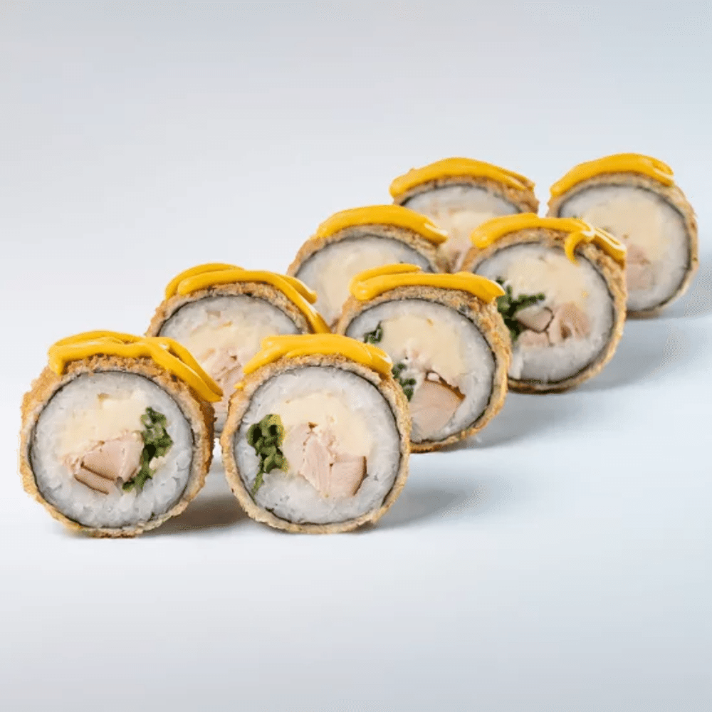 Нори, рис "SHINAKI", курица холодного копчения, сыр "Rokler", огурцы, соус "Сырный"