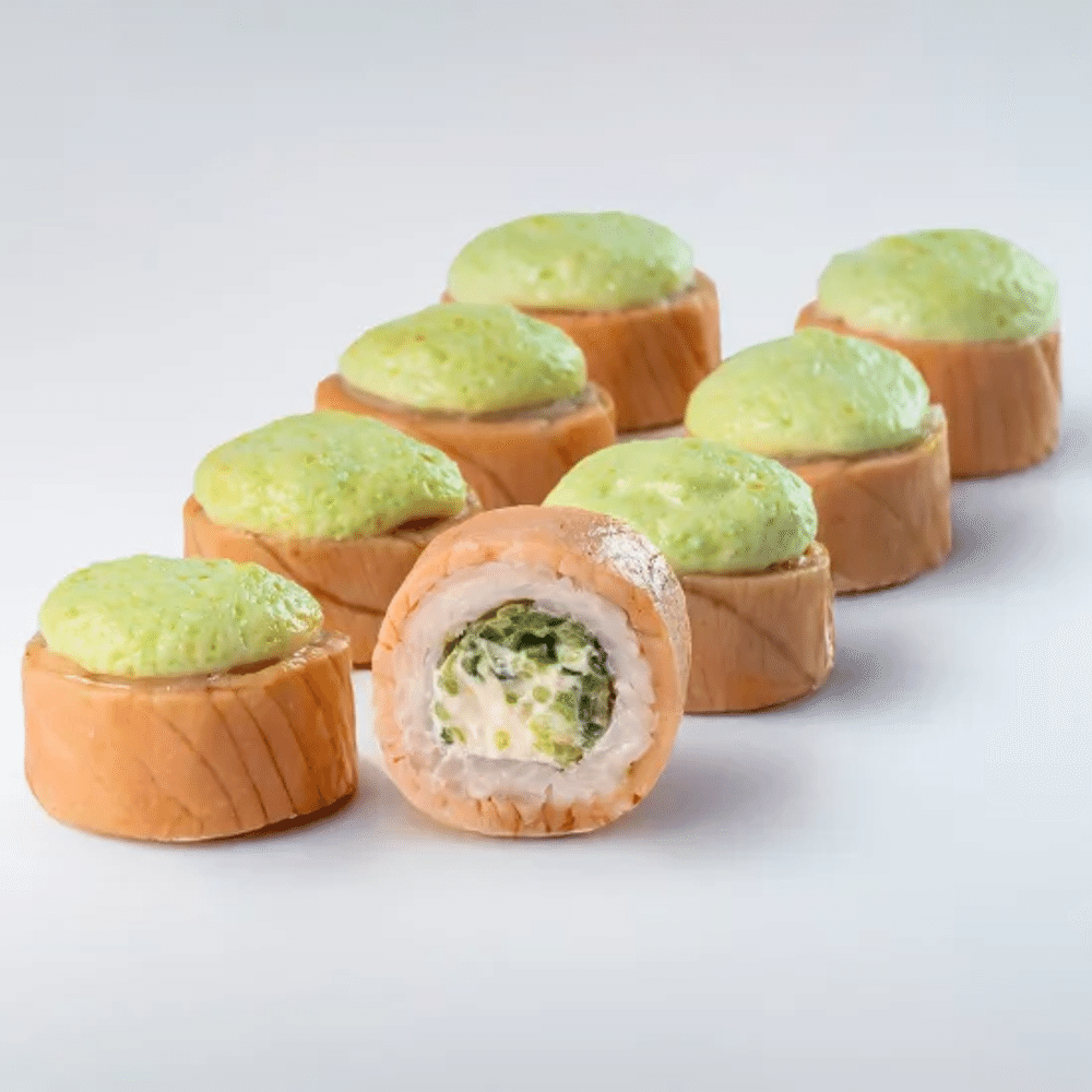 Нори, рис "SHINAKI", творожный сыр, норвежский лосось, огурцы, шапка для запекания Данный продукт может содержать мелкие фрагменты косточек