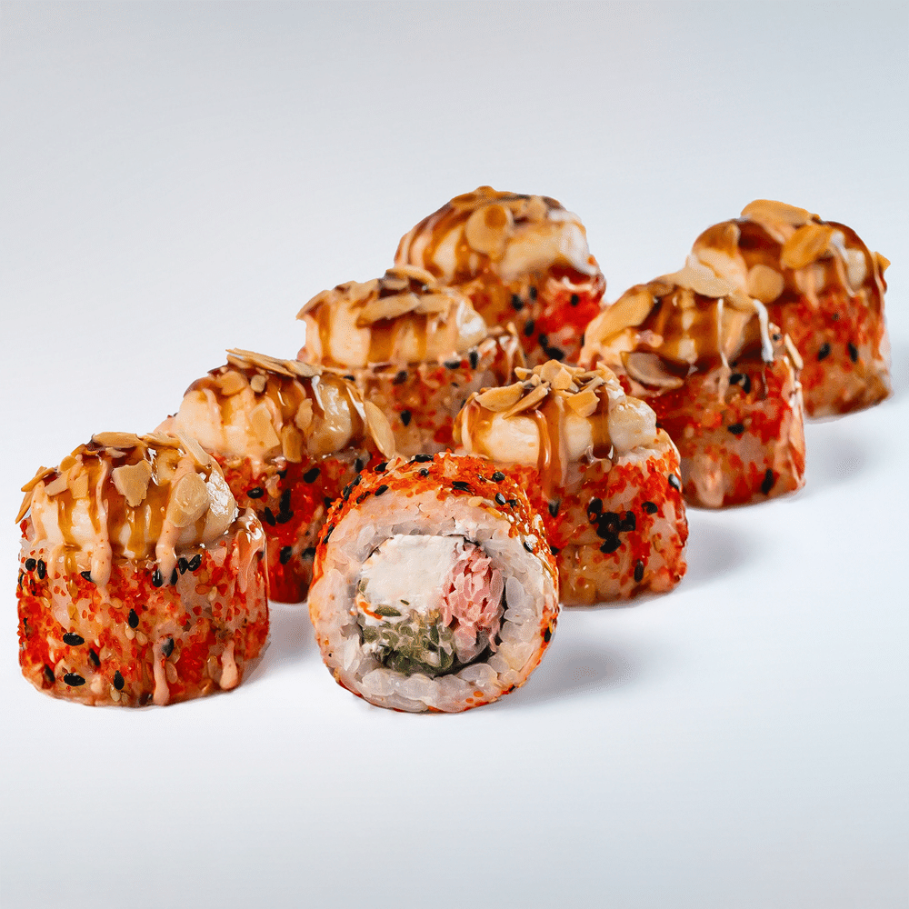 Рис, нори, сыр творожный, краб, капуста пекинская, икра масаго, кунжут, шапка сливочная, соус унаги, соус средне-острый