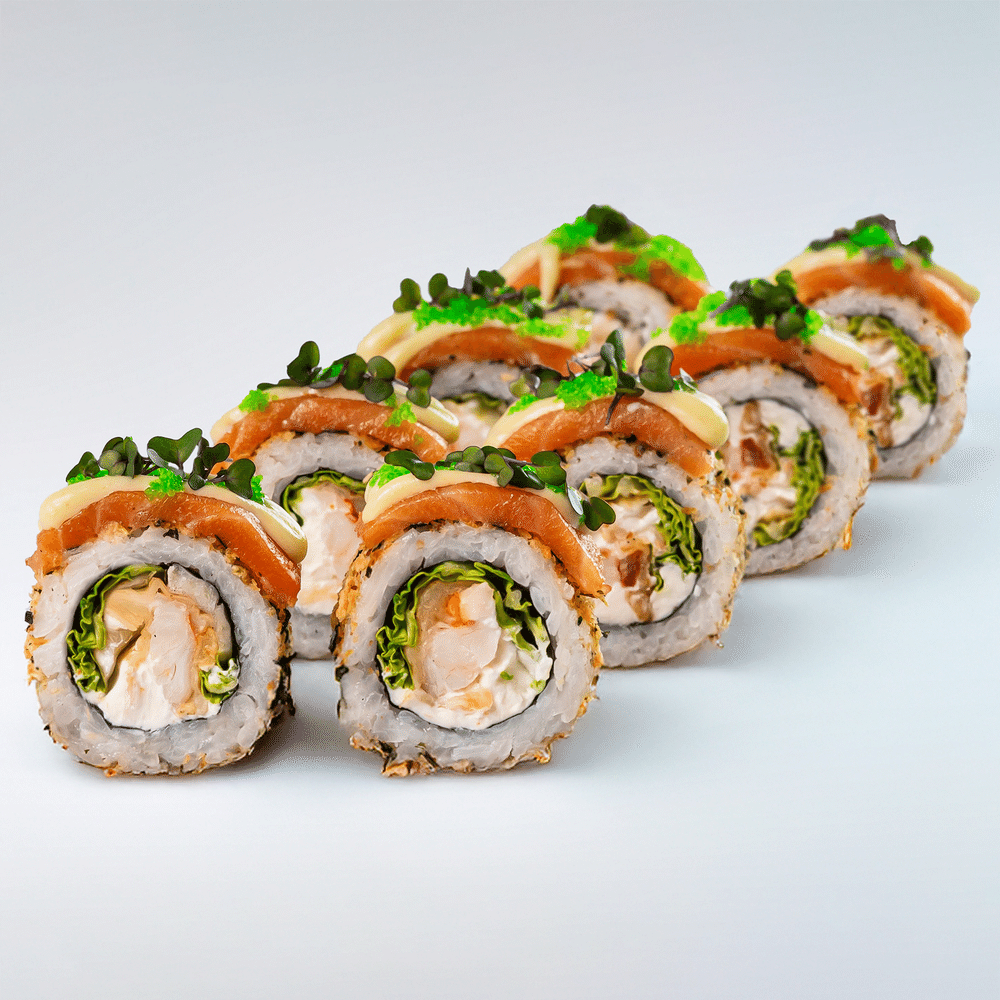 Рис, нори, сыр творожный, креветка жареная в панировке, семга, пекинская капуста, икра масаго, микрозелень, фирменный соус