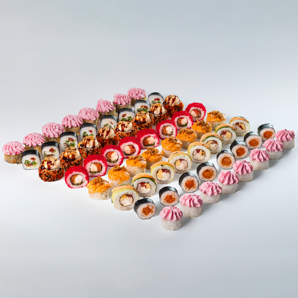 Лава с лососем 8 шт Лава темпура 8 шт Запеченный снежный краб 8 шт Овощной 8 шт Сяке маки 8 шт Сэмпай запеченный 8 шт Фрэш ролл 8 шт Калифорния с лососем 8 шт 5 соевых соусов 3 имбиря 3 васаби Данный продукт может содержать мелкие фрагменты косточек