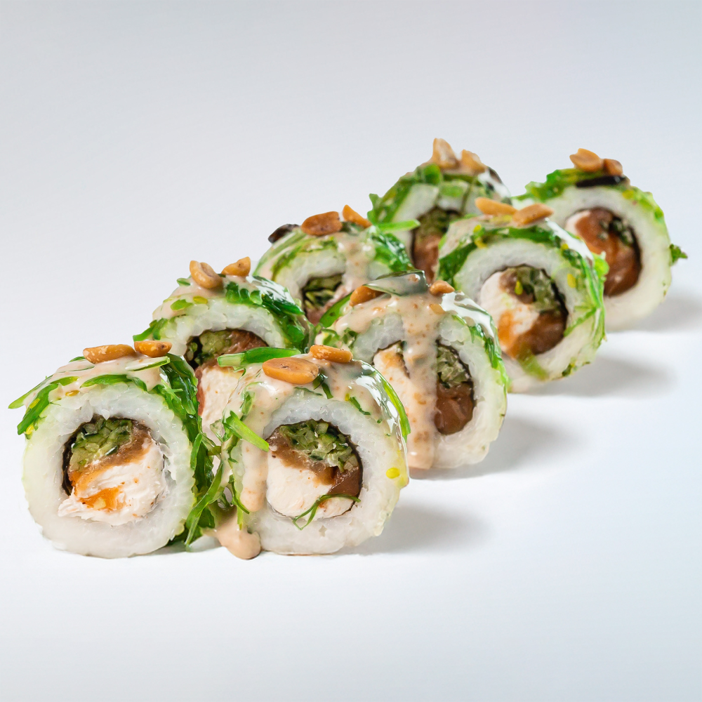 Нори, рис "SHINAKI", творожный сыр, норвежский лосось, огурцы, чука, ореховый соус, арахис Данный продукт может содержать мелкие фрагменты косточек