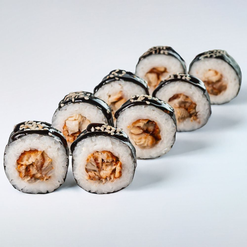 Нори, рис "SHINAKI", угорь, соус "Унаги", кунжут Данный продукт может содержать мелкие фрагменты косточек